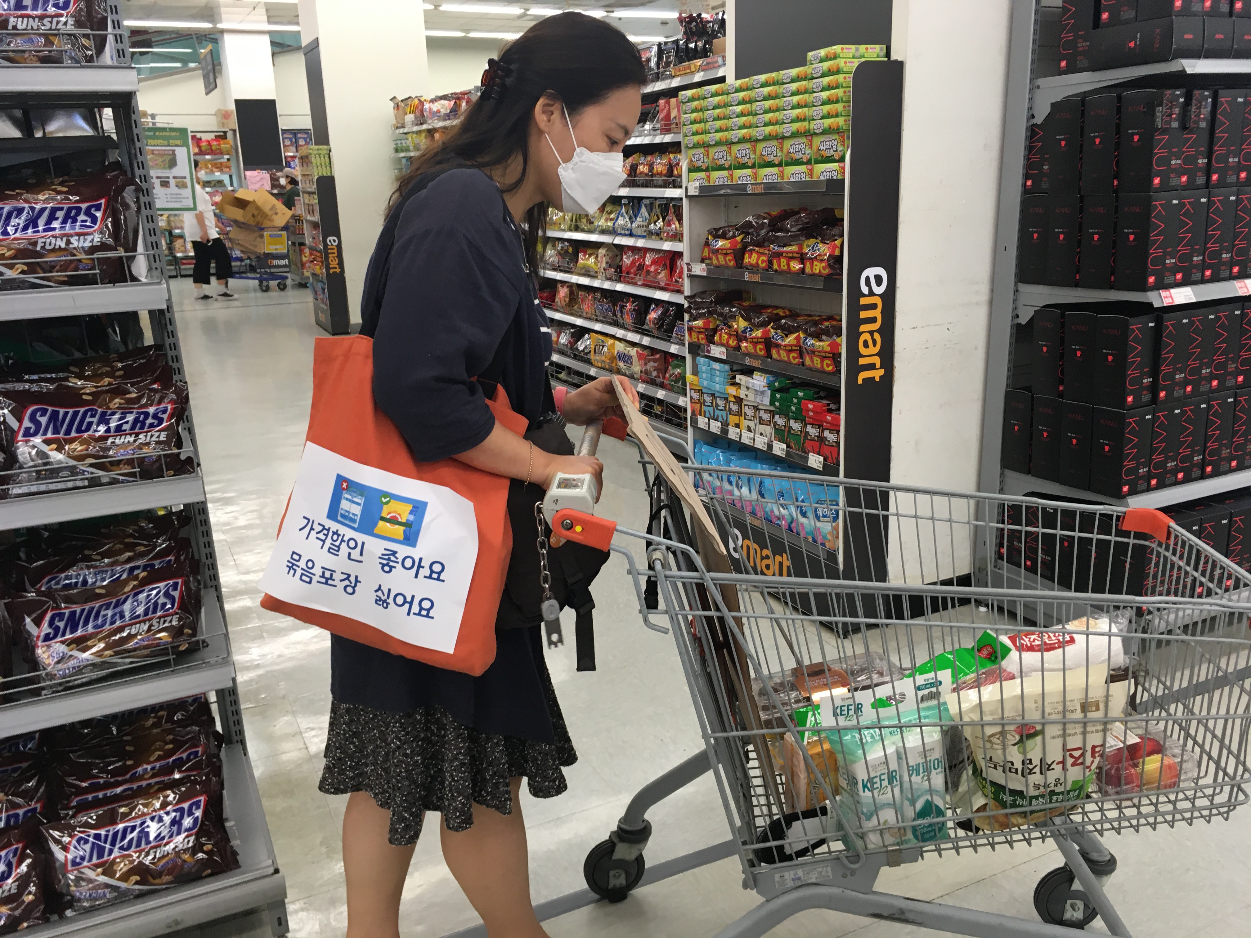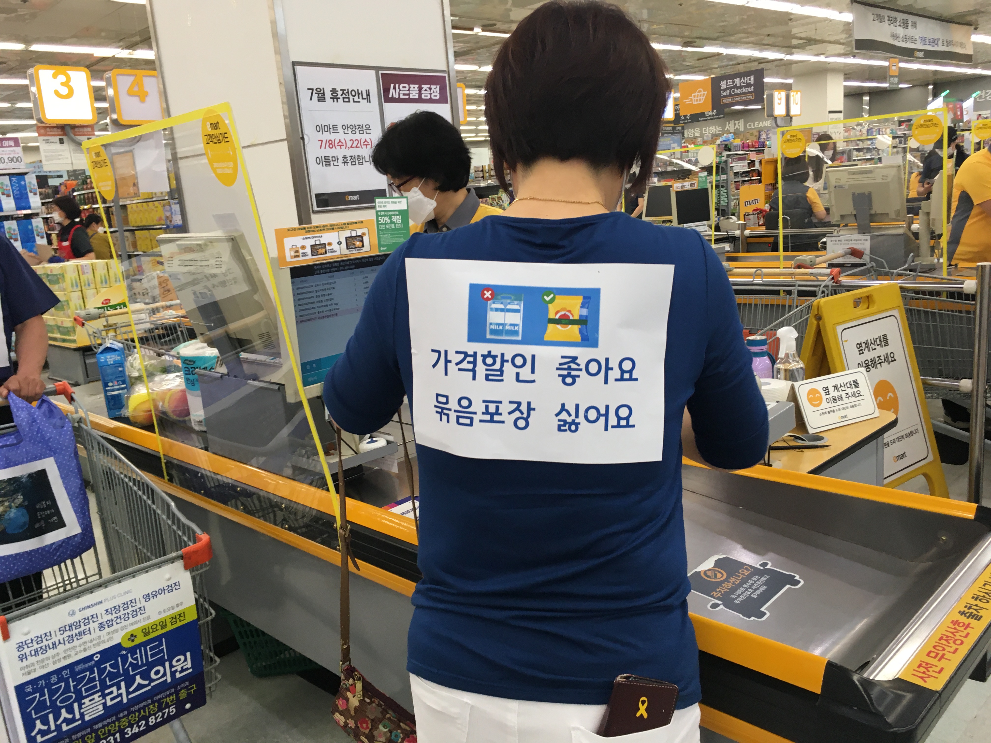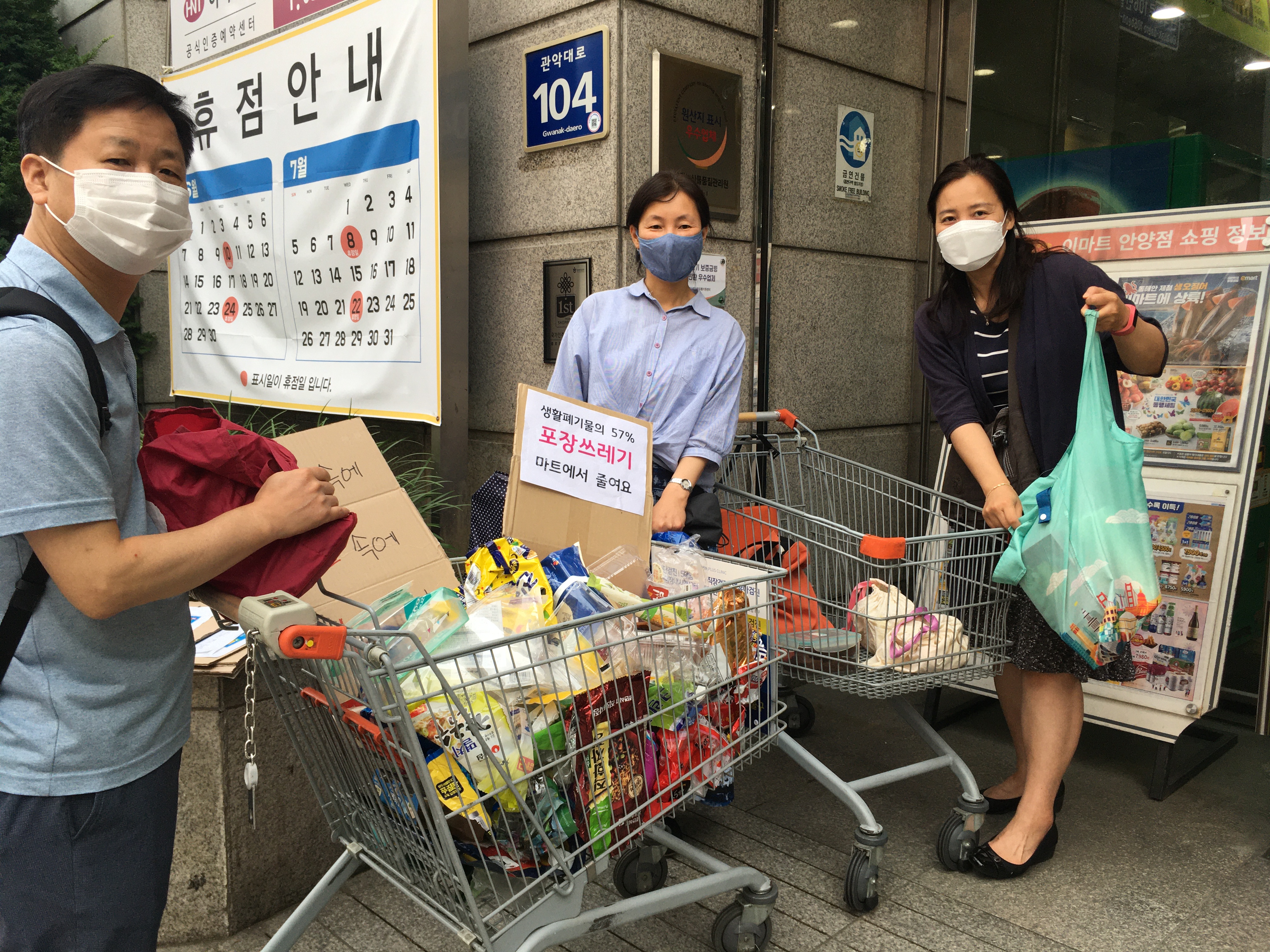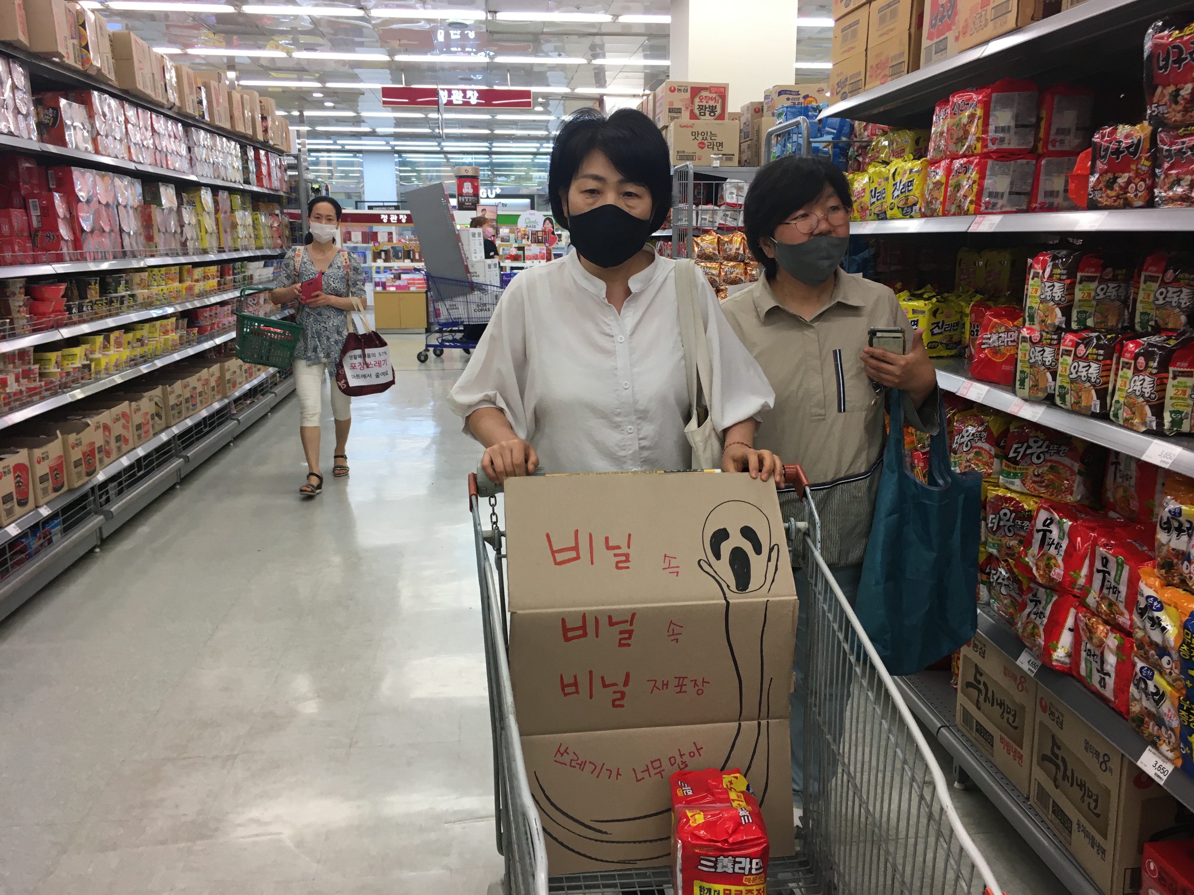 개인이 아무리 비닐 플라스틱 사용을 줄이려고 노력해도 제품의 생산과 유통 단계에서 포장을 줄이지 않으면 해결방법은 요원해 보입니다. 카트 하나 가득 비닐 포장재를 남겨 놓고, 12명의 시민들은 각자의 장바구니에 구입한 물건을 알맹이만 담아 들고 갔습니다. 재포장 금지 제도를 조속하게 실시하라는 무언의 시위를 쇼핑으로 보여준 것입니다.