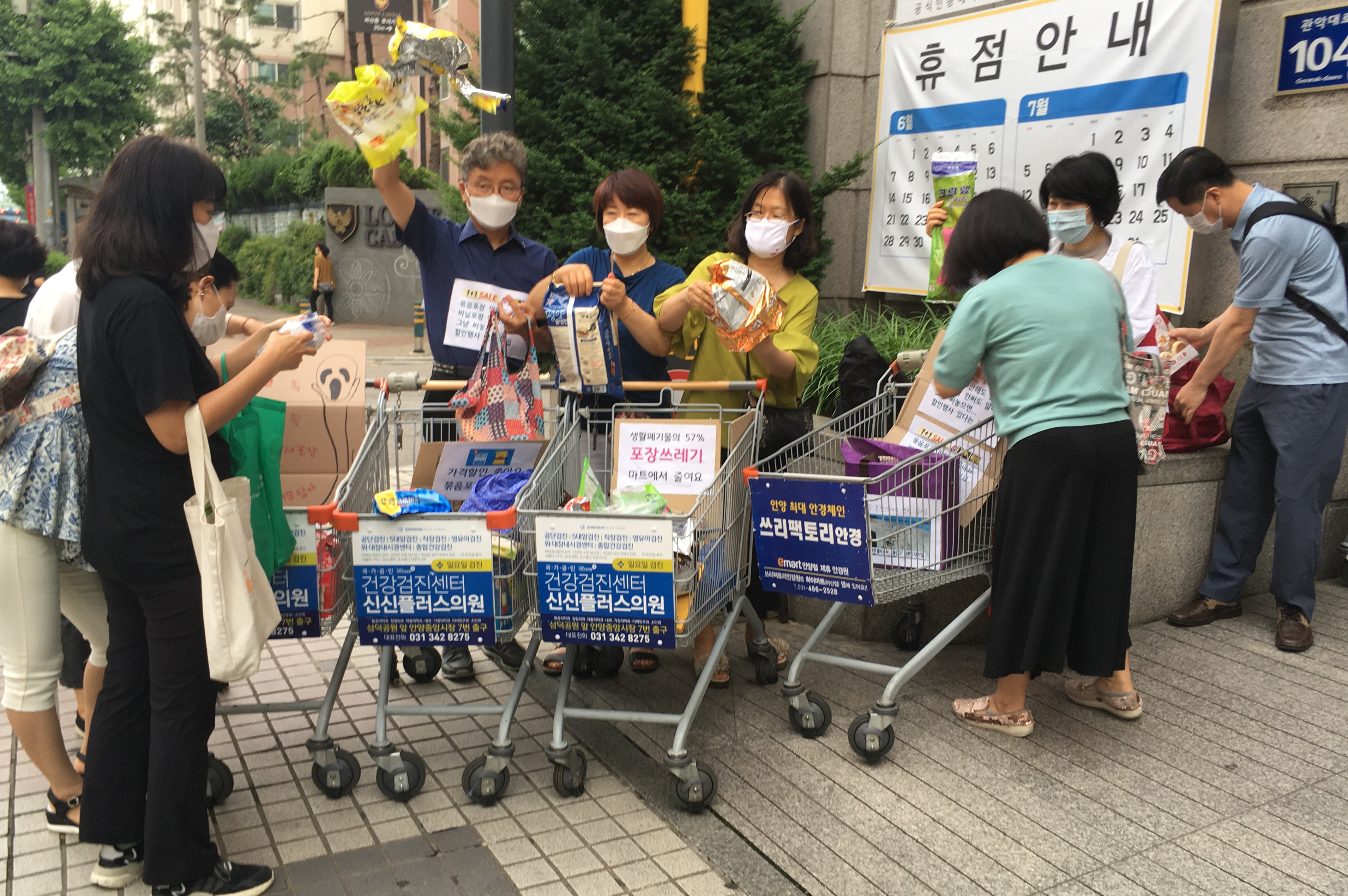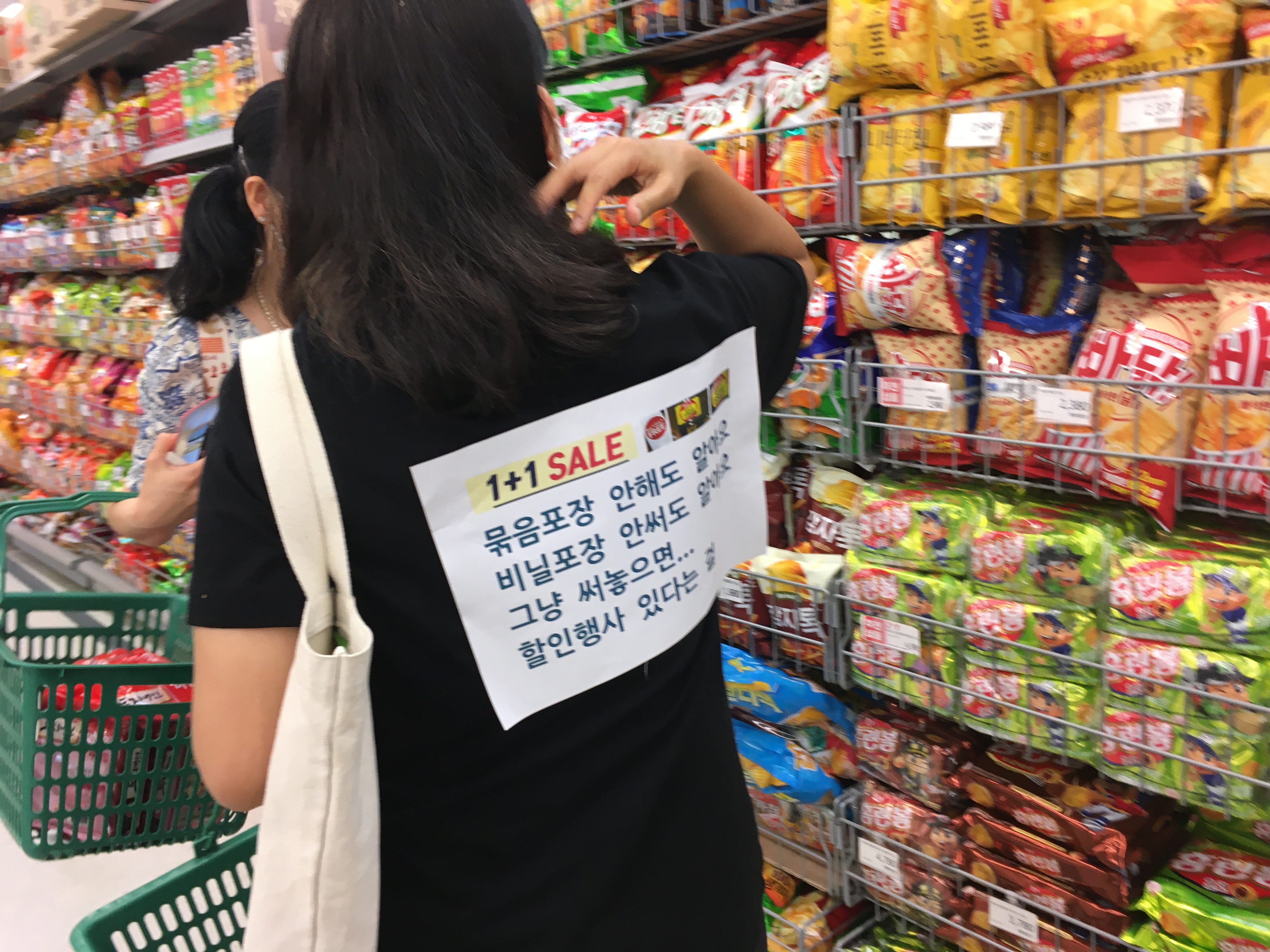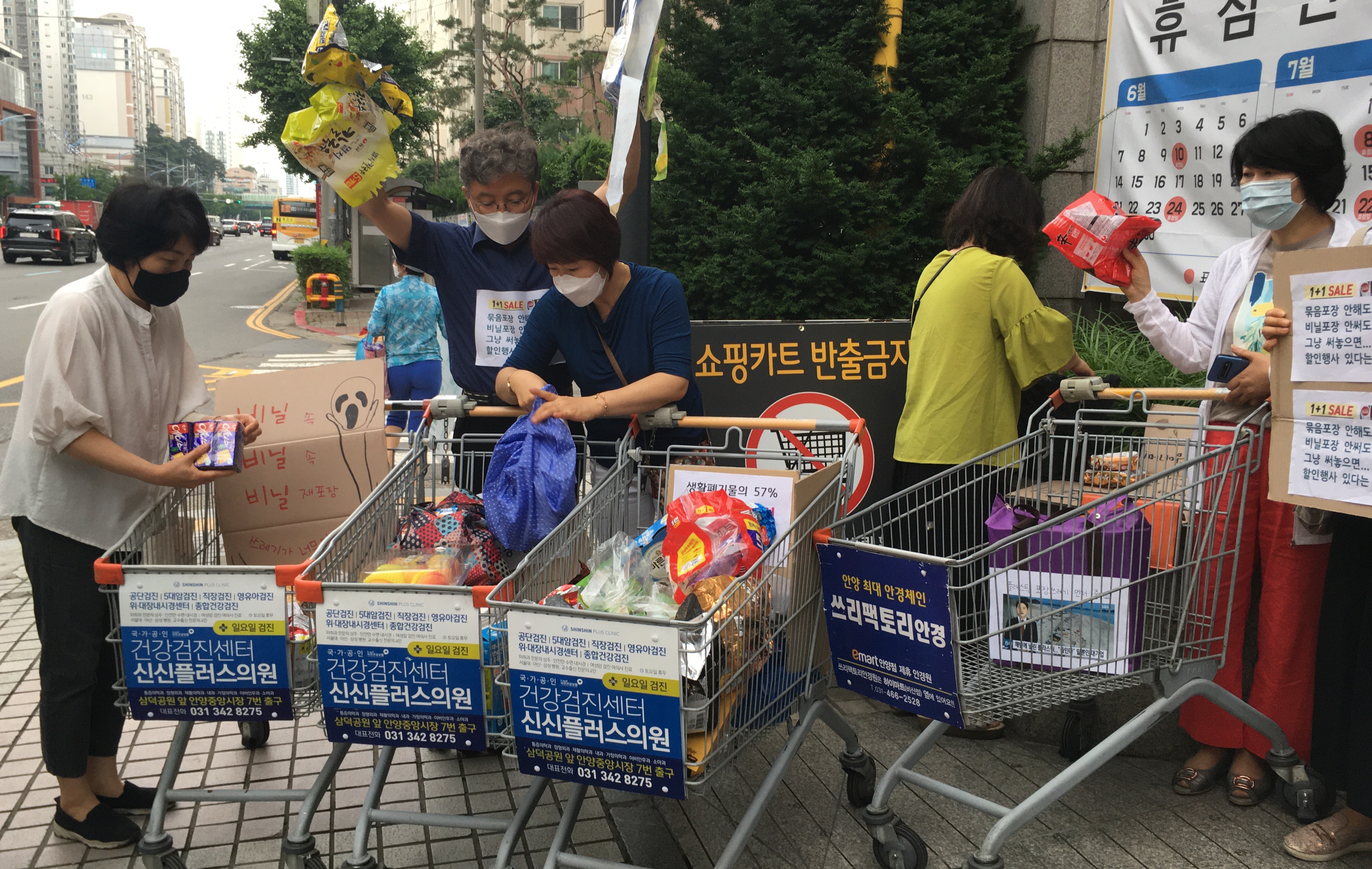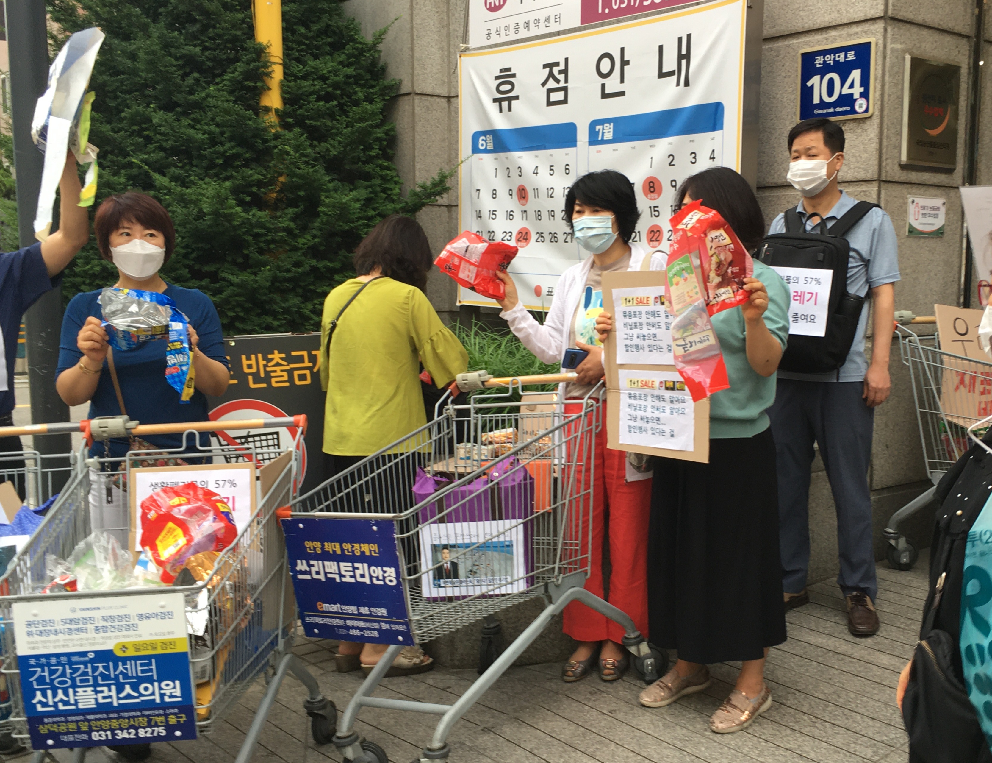 개인이 아무리 비닐 플라스틱 사용을 줄이려고 노력해도 제품의 생산과 유통 단계에서 포장을 줄이지 않으면 해결방법은 요원해 보입니다. 카트 하나 가득 비닐 포장재를 남겨 놓고, 12명의 시민들은 각자의 장바구니에 구입한 물건을 알맹이만 담아 들고 갔습니다. 재포장 금지 제도를 조속하게 실시하라는 무언의 시위를 쇼핑으로 보여준 것입니다.