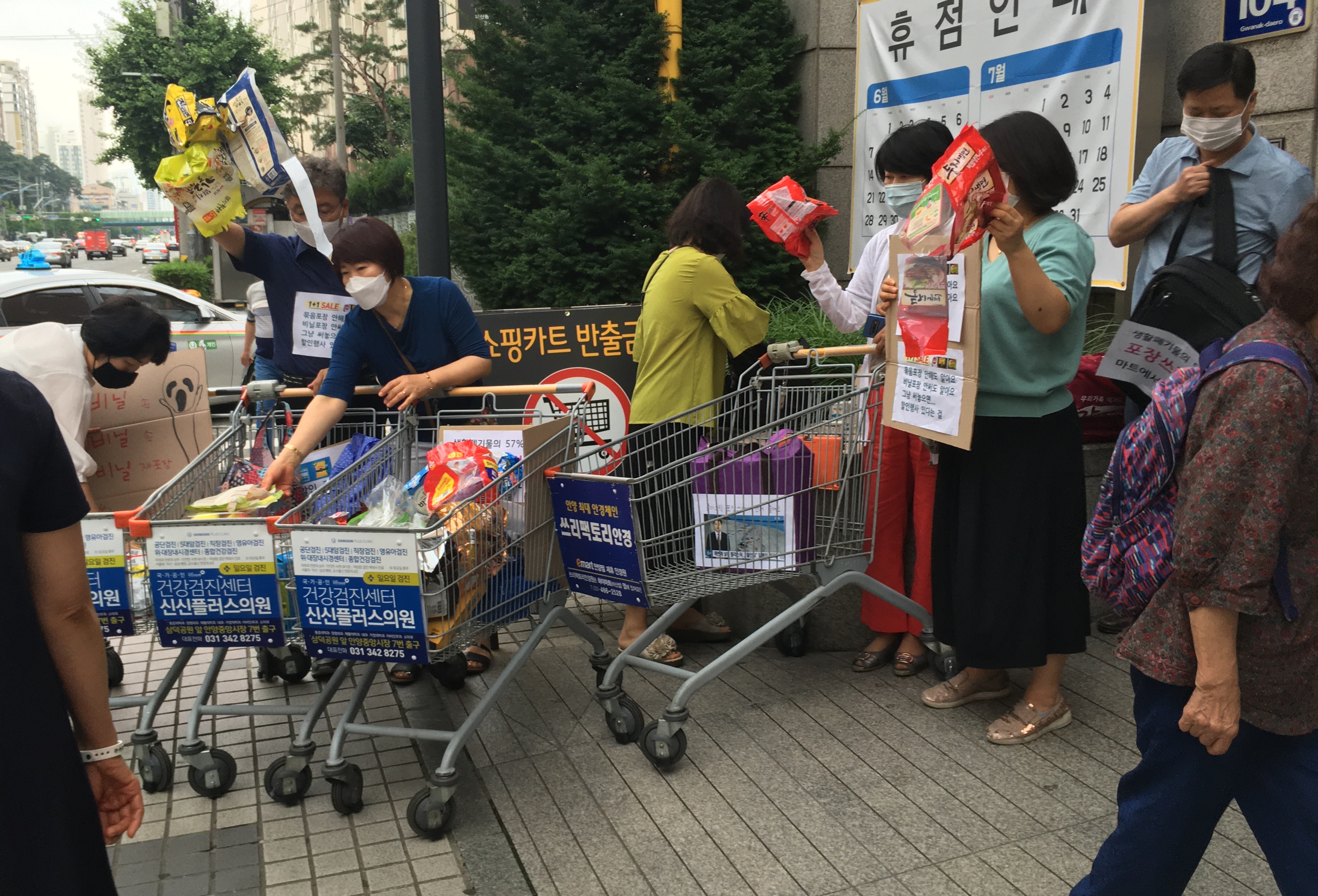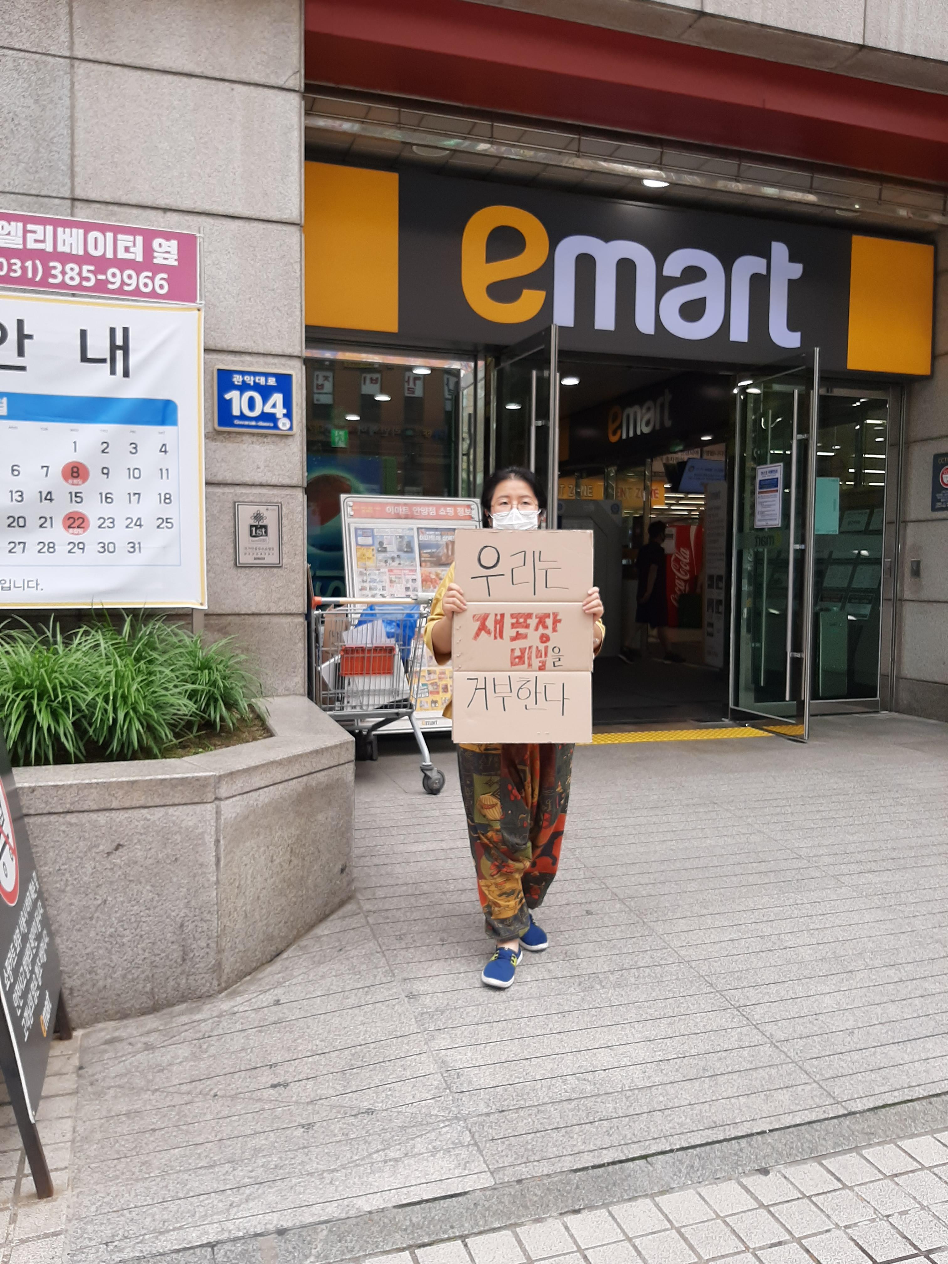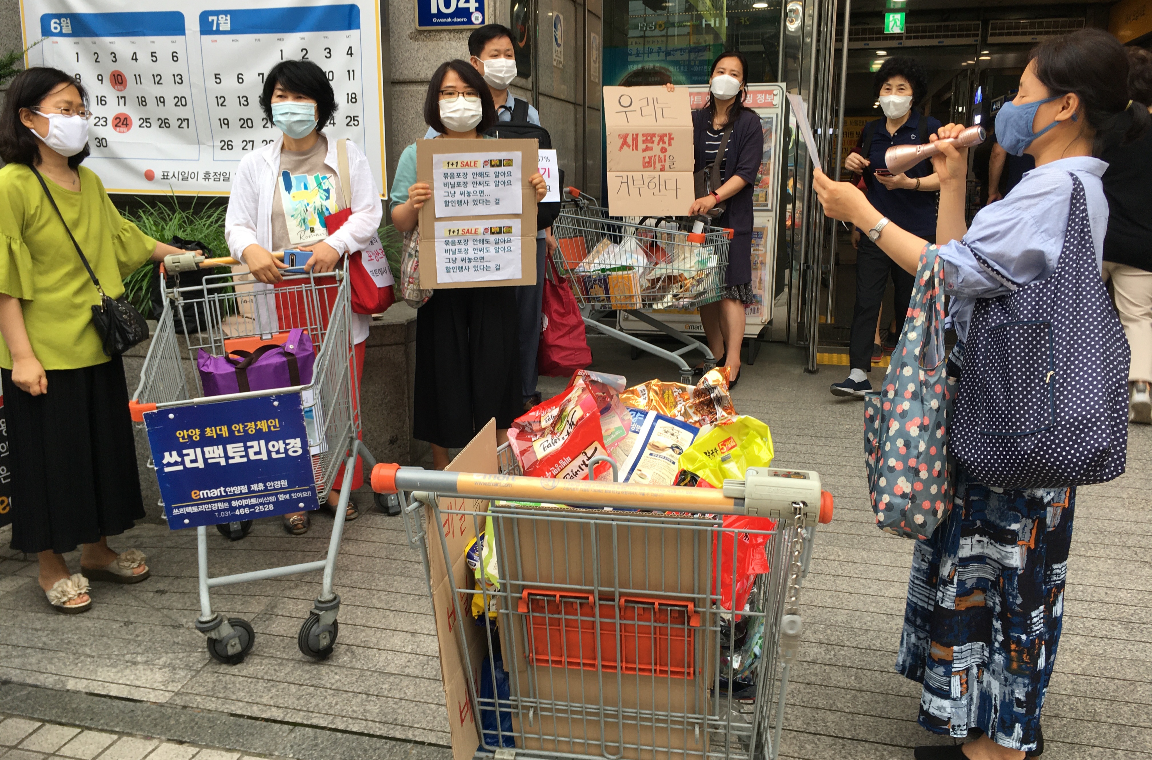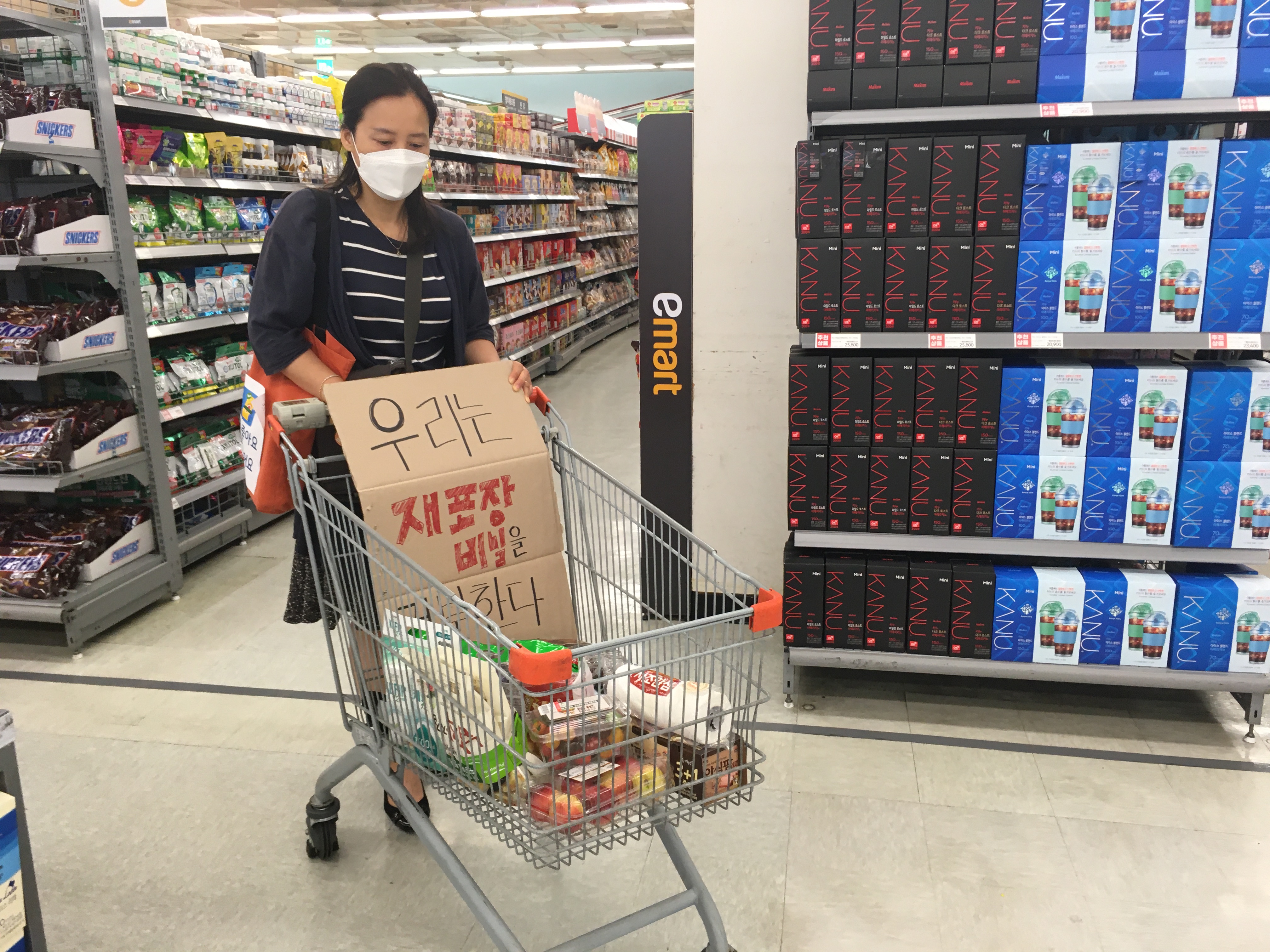 개인이 아무리 비닐 플라스틱 사용을 줄이려고 노력해도 제품의 생산과 유통 단계에서 포장을 줄이지 않으면 해결방법은 요원해 보입니다. 카트 하나 가득 비닐 포장재를 남겨 놓고, 12명의 시민들은 각자의 장바구니에 구입한 물건을 알맹이만 담아 들고 갔습니다. 재포장 금지 제도를 조속하게 실시하라는 무언의 시위를 쇼핑으로 보여준 것입니다.