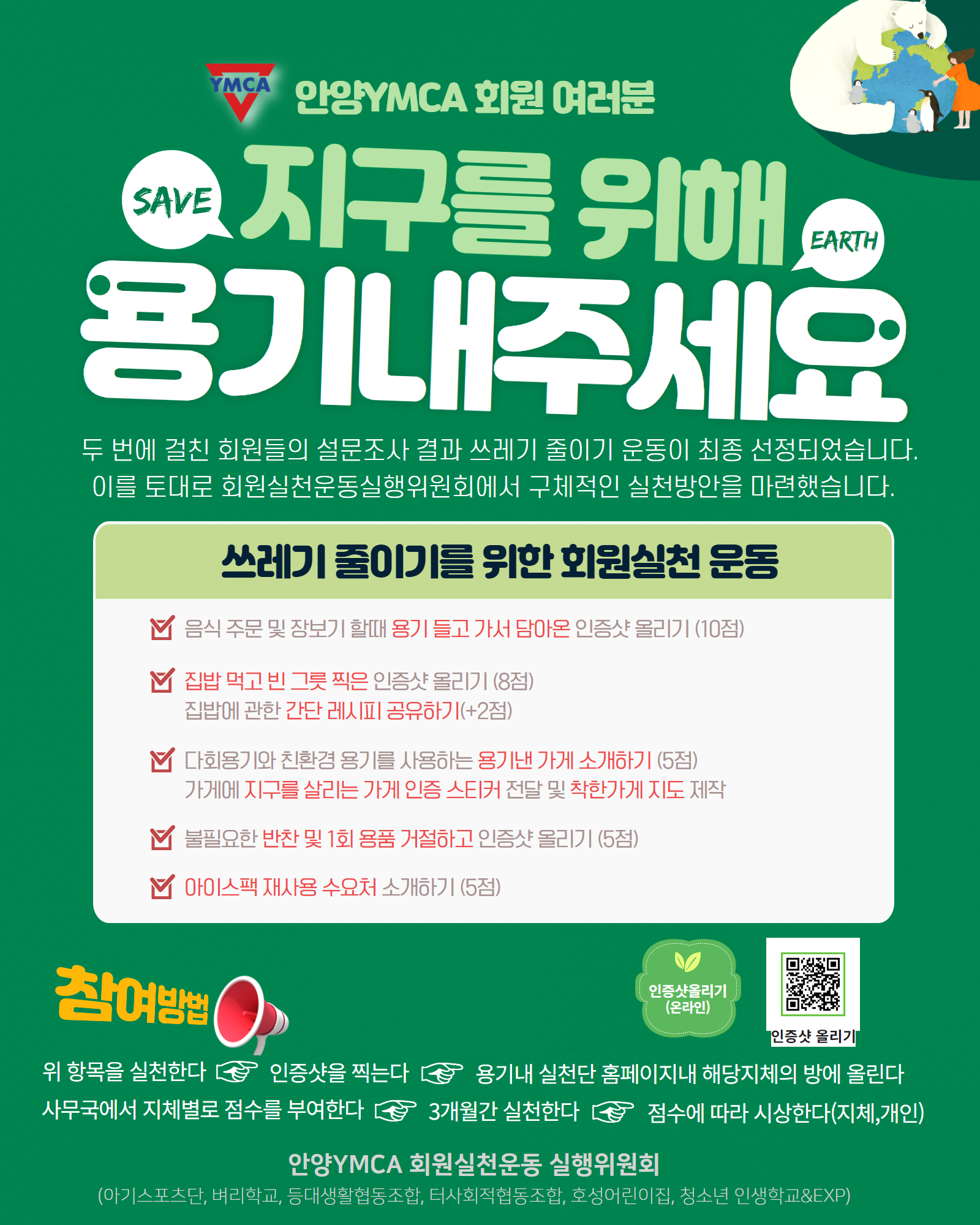 안양YMCA에서 환경보호를 위해 쓰레기 줄이기 회원실천운동을 실시하고 있습니다.