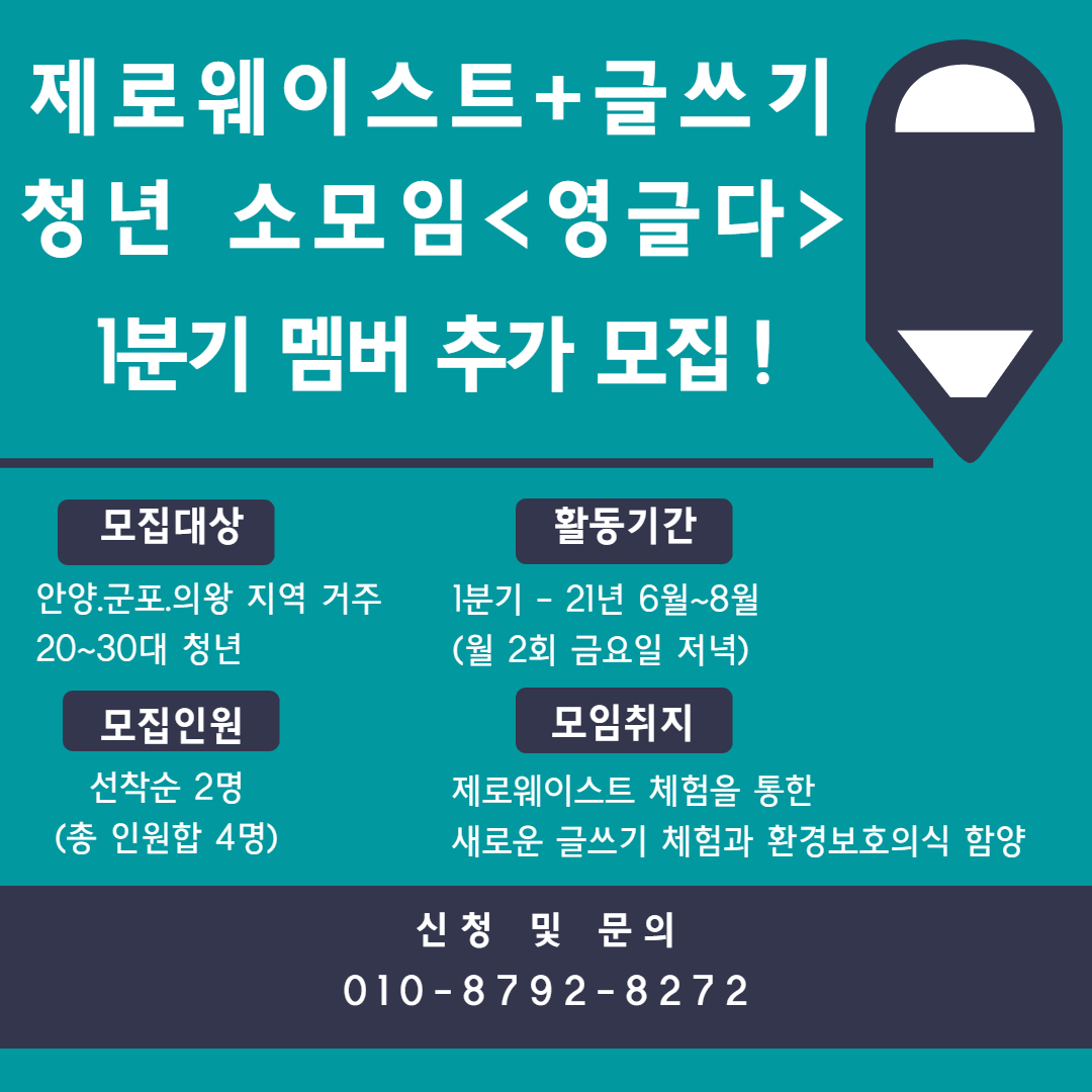 제로웨이스트 글쓰기 청년 소모임 <영글다> 에서 1분기 멤버 추가 인원 모집을 합니다.