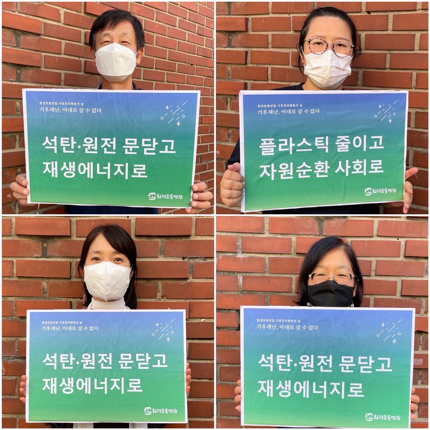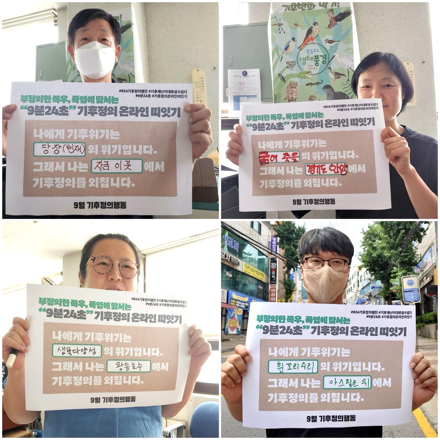 기후위기 안양비상행동은 안양군포의왕환경운동연합 회원을 중심으로 ‘924기후정의행진’의 사전행사인 ‘부정의한 폭우, 폭염에 맞서는 “9분 24초” 기후정의 온라인 띠잇기’에 동참했습니다. 온라인 피켓팅으로 안양 지역의 회원들과 함께 개인에게 기후위기는 어떤 의미인지를 지역에서 알렸습니다. 또한 환경운동연합 기후정의행동의 날 피켓팅에 동참해 석탄과 원전을 대신 재생에너지로 전환을 촉구하는 피켓을 들고 거리에 나섰답니다.