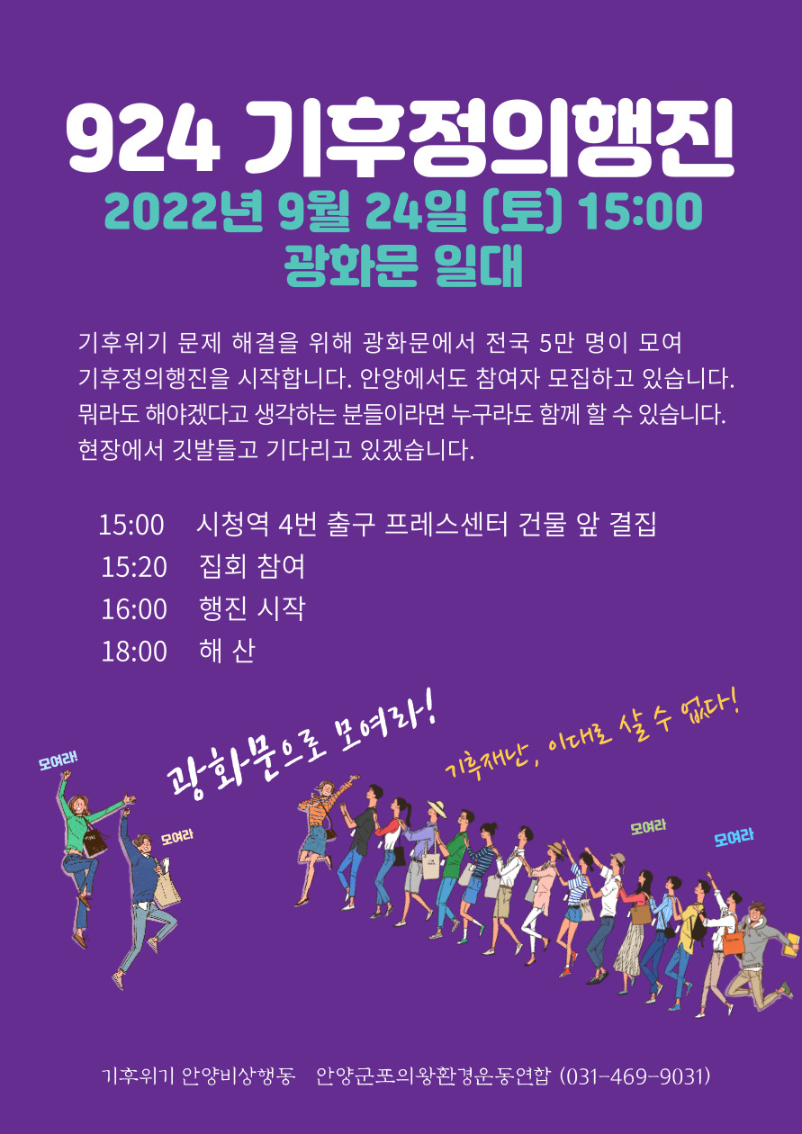 기후위기 안양비상행동은 9월 24일 오후 광화문 일대에서 열리는 924 기후정의행진에 참여할 계획이구요, 이들은 시청역에 집결해 기후위기 문제 해결을 촉구하는 집회와 행진에 동참할 것입니다.